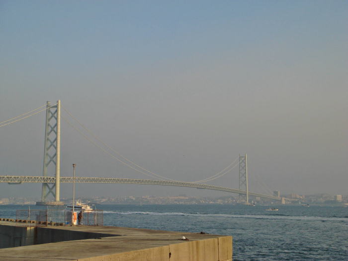 局近くの岩屋港から見える「明石海峡大橋」。