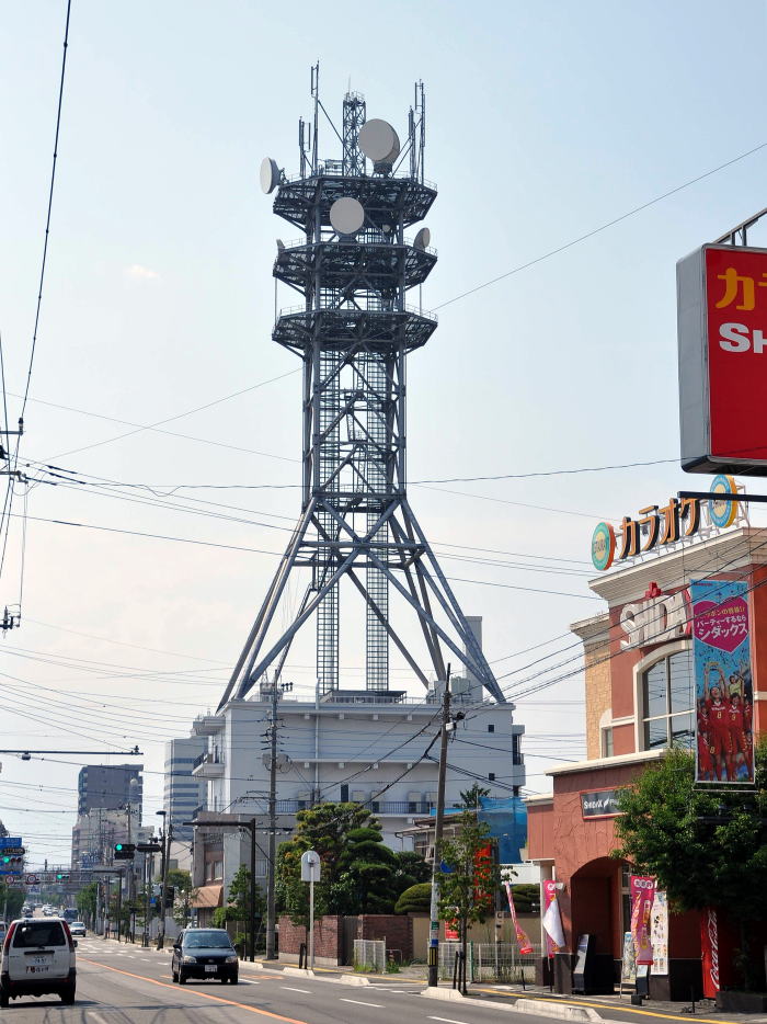 局舎屋上ギリギリ、絶妙なバランスで立つ鉄塔