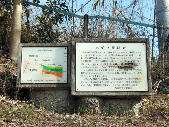 今から約70万年くらい前、近畿地方にはかなり広い範囲にわたって、火山灰が降りました。この火山灰が当時の海や湖に堆積して、近畿一円に凝灰岩層となって点々と残りました。当時の水底は、その後の地殻変動で、今日では陸地の丘陵となったり、逆にもっと地下深く埋もれたりしています。この凝灰岩の地層は、火山灰の特徴のほかに、あずき色をしているので「あずき凝