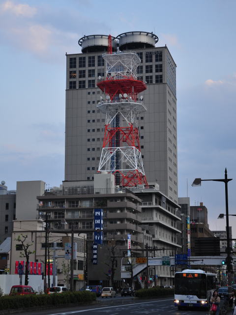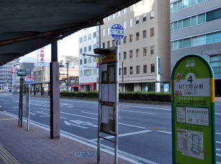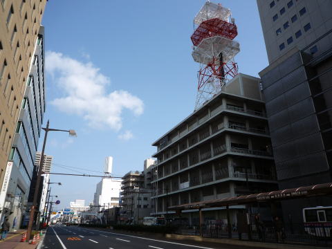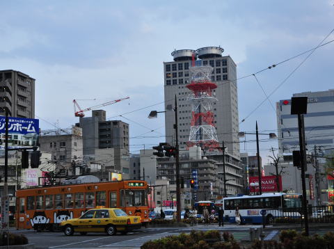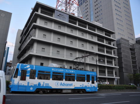 ビル前を走る「岡山電気軌道(岡電)」の路面電車。