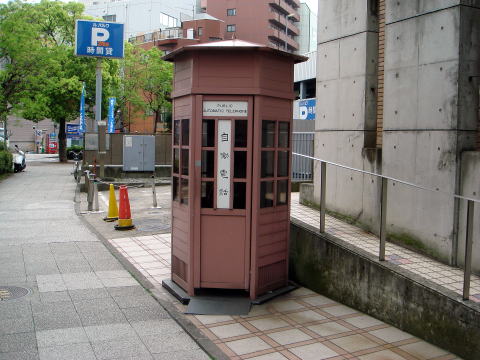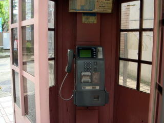 この電話ボックスは、「自働電話」と呼ばれた当時の公衆電話の形を復元したものだそうです。