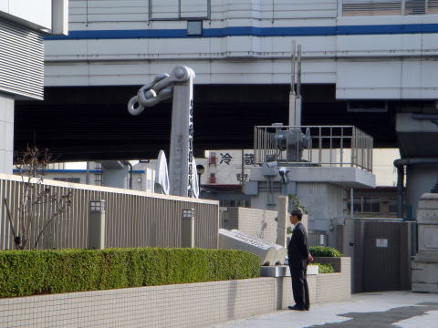 ビル前にある錨と本の形の記念碑。