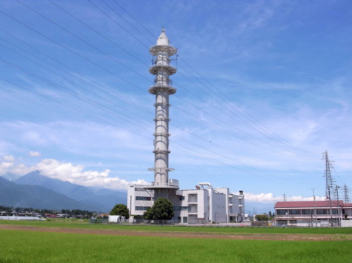 遥か北アルプス(飛騨山脈)を望む壮大な鉄塔です。