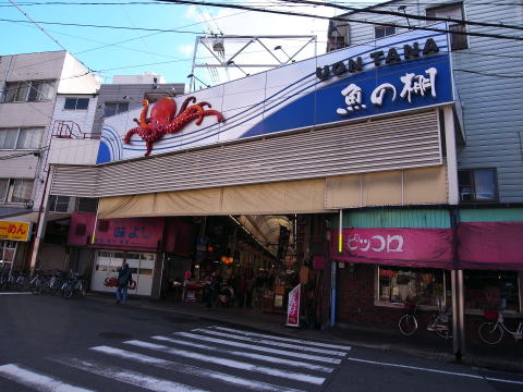 局程近くの魚の棚(うおんたな)。鮮魚店が多い商店街。