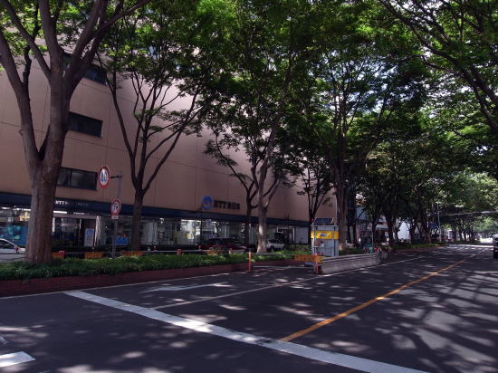 ケヤキ並木の木漏れ日が美しい局前。