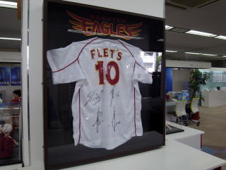 | 東北楽天ゴールデンイーグルスのサイン入りユニホームなどが飾ってありました。店員の方の聞くと、NTTが楽天を応援している(スポンサー?)のであるんですよ、とのこと。 |