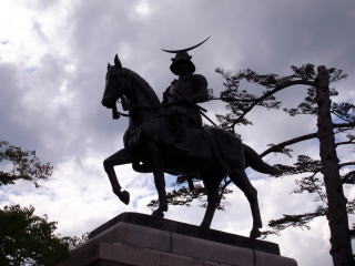 伊達政宗騎馬像と、城内公衆電話