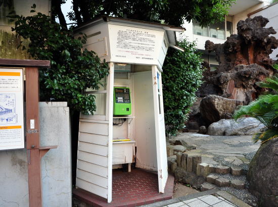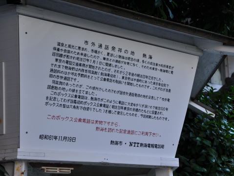 このボックス公衆電話は, 熱海市がこのように電話に大変ゆかりが深いので明治100年を記念してわが国最初のボックス公衆電話 (明治33年東京の京橋のたもとに設置され、ボックスの型は六角形で白塗りでした)を模して復元したものを、今回改装したものです。