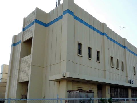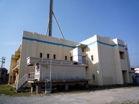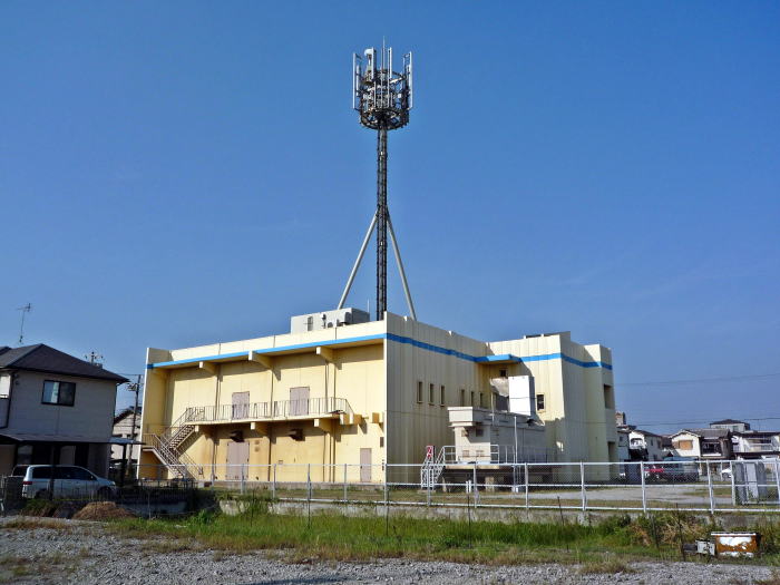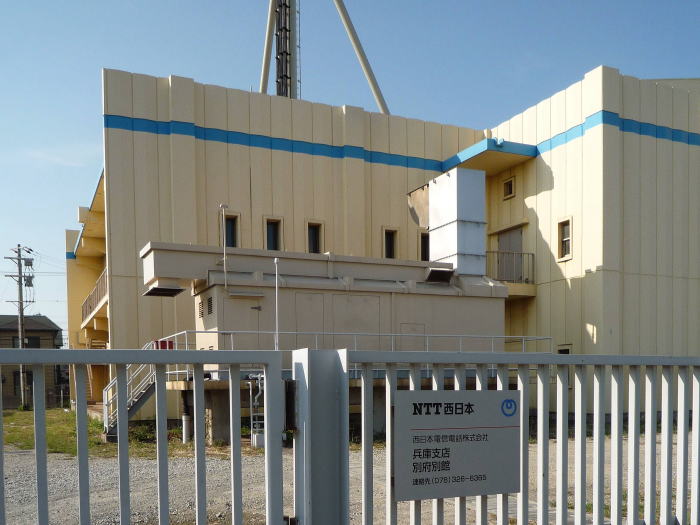 他に類を見ない「けったいな」形の電話局です。青いラインもまた、けったいです。