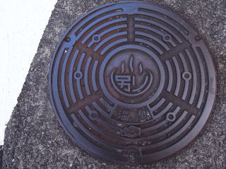 「温泉」と標された温泉マーク入マンホール。