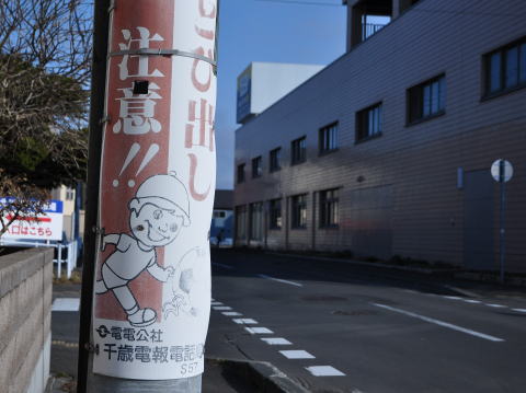 「電電公社 千歳電報電話局 S57」と記された、とび出し注意看板。