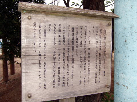 これらの電柱も、古い歴史を持つおはらい町の再開発計画(街並保存)の一環として、電話線の地中化が行われることとなり、平成四年十月に全て取り除かれました。この電柱はその内の一本で、昭和初期としては非常に数少ないコンクリート電柱であることから、ここに保存することとしました。 (板より抜粋)