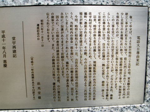以来、時世の移り変わりは激しく、地域拡張のため当の小川氏は移住せねばならなくなりましたため、この御佛は廿人講町より現在の橘町へ遷座されました、その際、今の吉田由太郎氏より三代前の浴場主が新しい宮殿を建立いたしました。