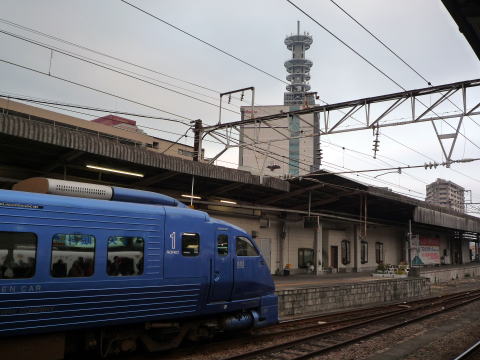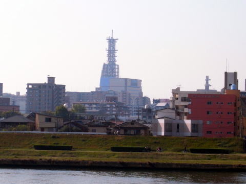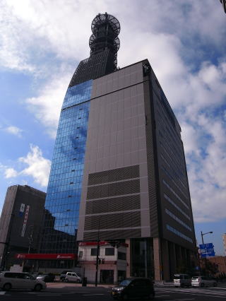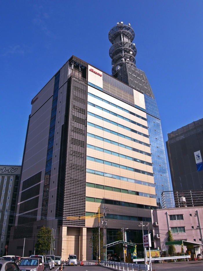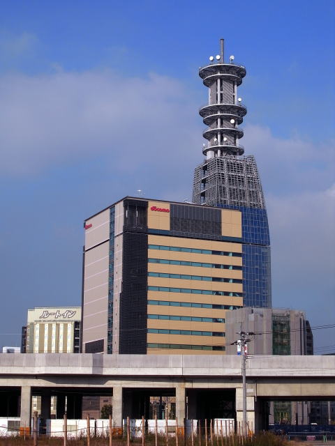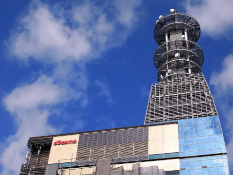 鉄塔とビル側面の曲線がつながった個性的なデザイン。