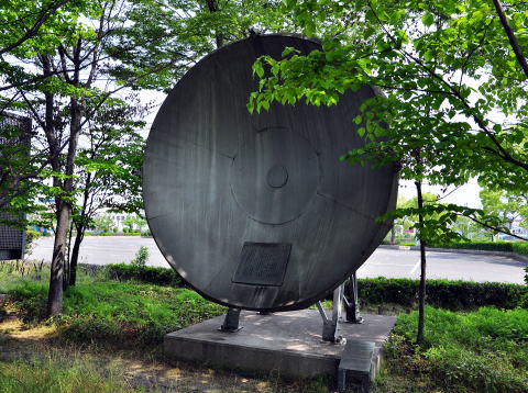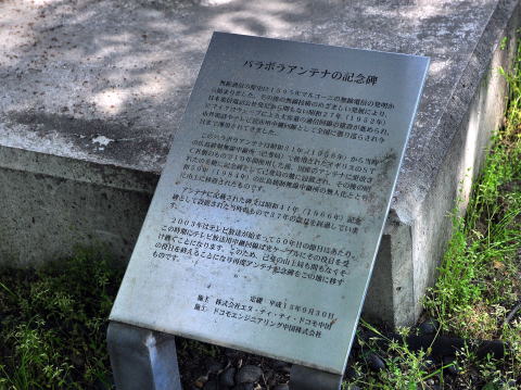 このパラボラアンテナは昭和31年(1956年)から当時の広島統制無線中継所(己斐局)で使用されたイギリスのSTC社製のもので10年間使用した後、国産のアンテナに更改されたのを機に記念碑として己斐局の麓に設置され、その後の昭和59年(1984年)の広島統制無線中継所の無人化とともに山上に移設されたものです。