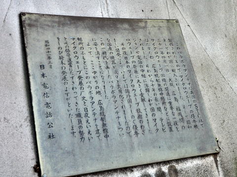 よって、ここゆかりの広島統制無線中継所のふもとにこのパラボラアンテナを建て、マイクロウェーブ発展の歴史と、日々えいえいとその保守運営にたずさわってきた職員の努力をしのび将来の発展のよすがといたします。