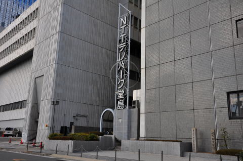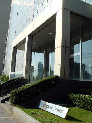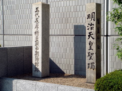 「五代友厚精藍西朝陽館跡」(ビル前の碑)。