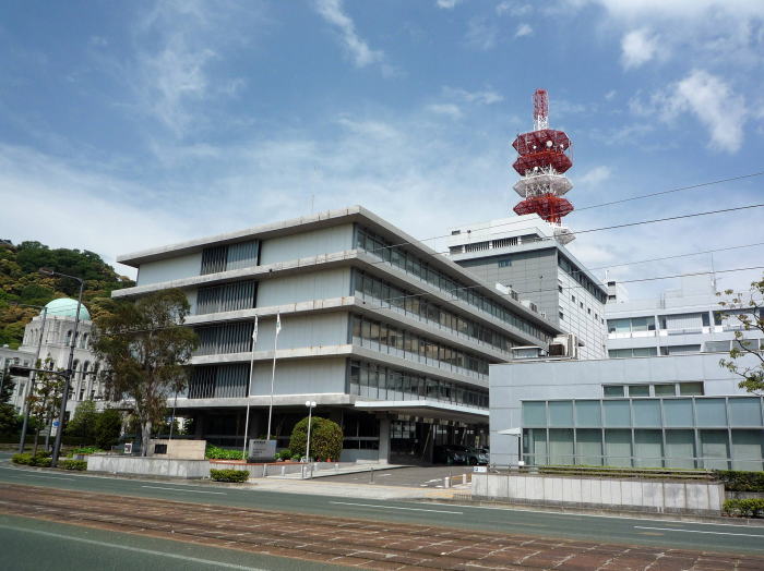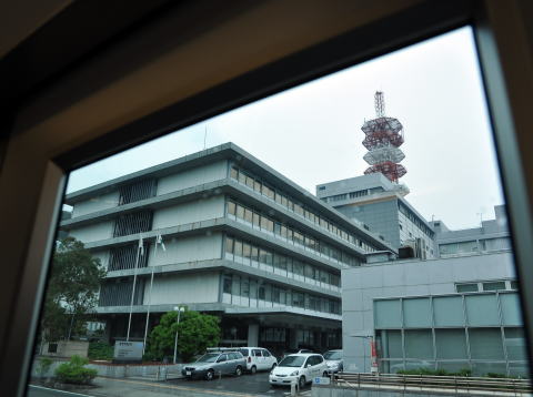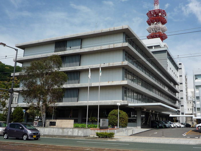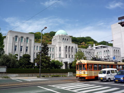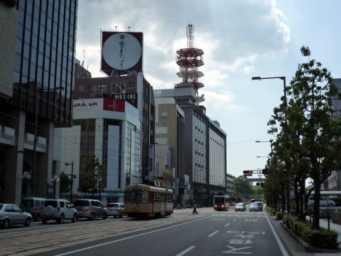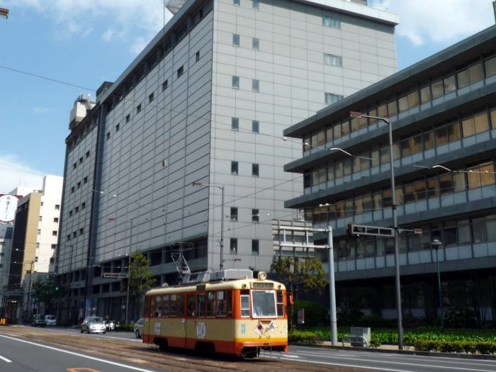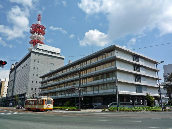 局前を走る伊予鉄道城南線(路面電車)と、愛媛県庁本館