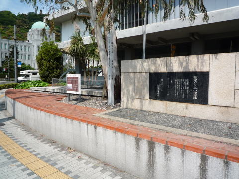 夏目漱石は、明治二十八年、ここで英語を教えました。名作「坊っちゃん」は、松山中学校を舞台にして書かれました。 四国電電ビル新築にあたり、往時校庭にそびえていたユーカリの一樹をそえて記念碑を建立します。
