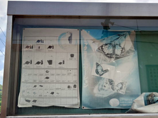 古い電話機とテレホンカードのポスターが掲示されたままでした。