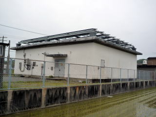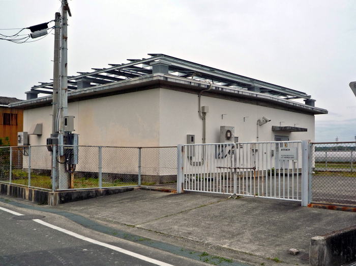 屋根に太陽光発電パネルを設置している電話局。