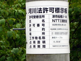 ダム付近電柱に掲げられていた「河川法許可標示板」。