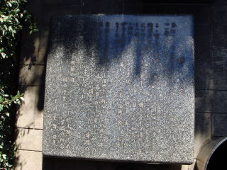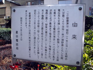 この慰霊碑は、昭和二十年三月十日未明の大空襲により当地一帯が焼野原と化した際、電話局も全焼し前夜から勤務していた十五歳を最年少とする電話交換手二十八名及び男子職員三名が最後まで職場を守り殉職された。職員の霊と、関東大震災において殉職された男子職員二名の霊を慰めるとともに、二度とこのような悲劇の起こらないことを祈願して昭和三十三年三月十日に建立されました。慰霊碑右手前には吉川英治氏の自筆による碑文があります。
