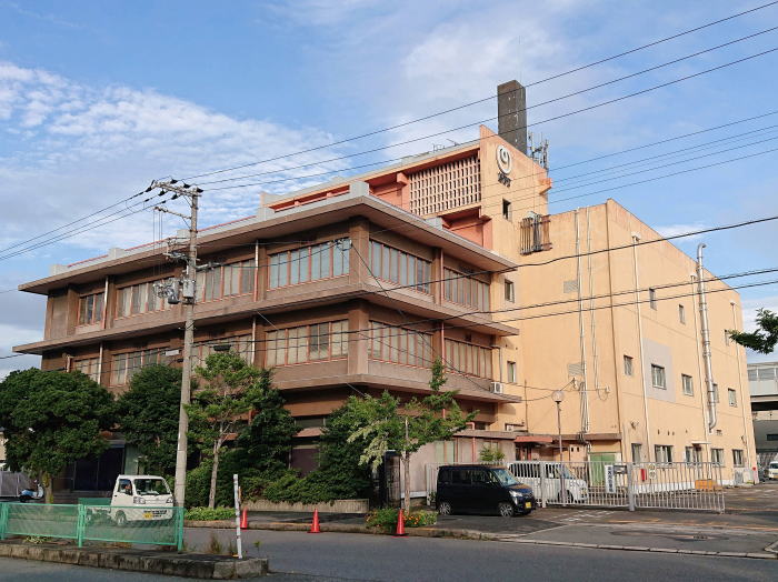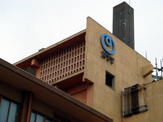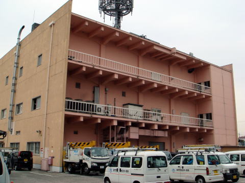 ピンク色の外壁が可愛らしい電話局。