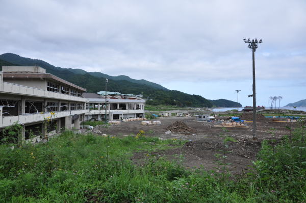 甚大な津波被害を受けた越喜来(おきらい)小学校と、越喜来湾。
