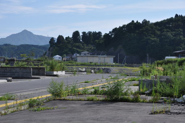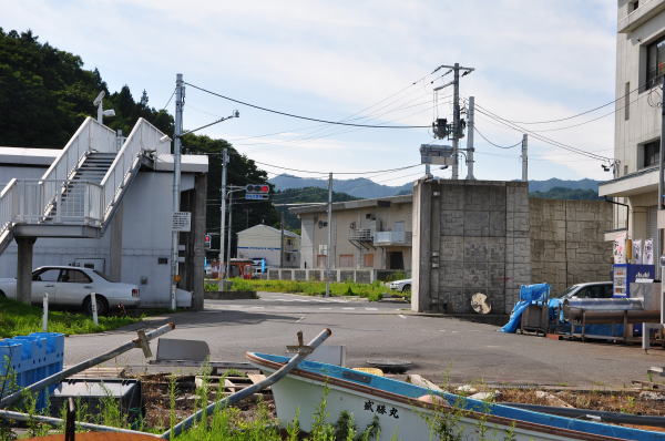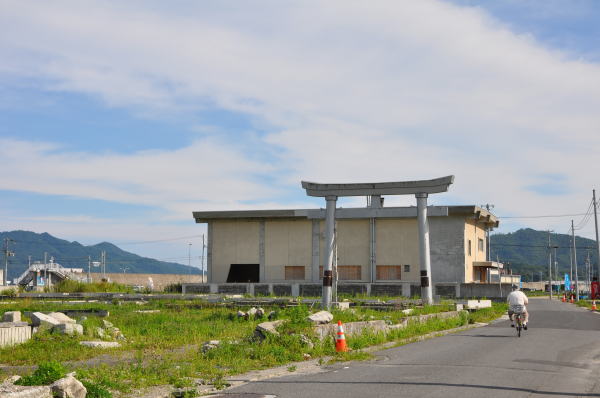 海岸との距離は100m程。津波を耐え抜いた電話局の堅牢さを実感しました。