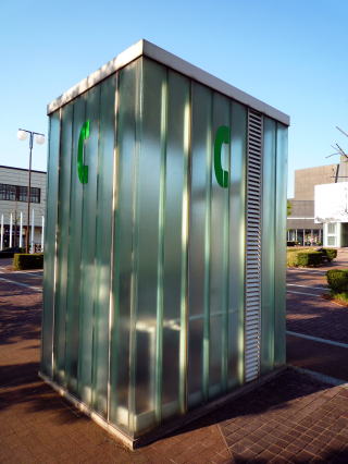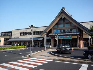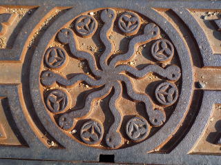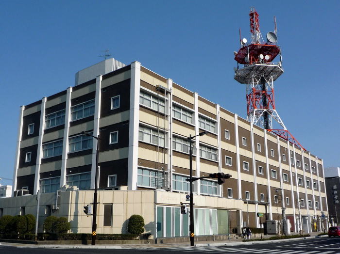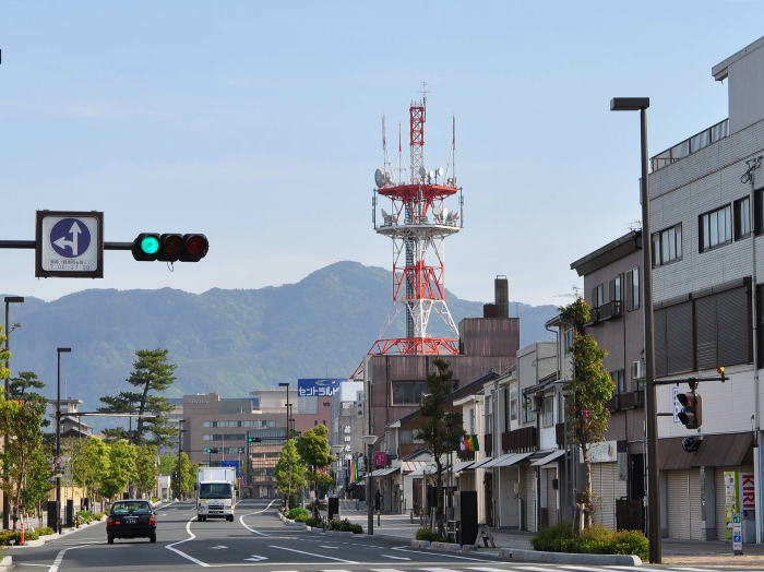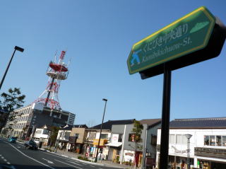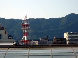 駅前から見えた鉄塔と、ヤマタノオロチを模した放水口蓋。