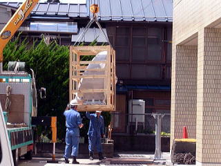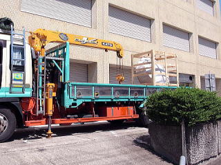 荷台から下ろされ、クレーンで鉄塔まで吊り上げられるようでした。