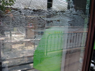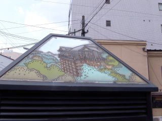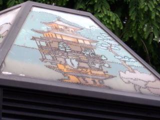 電話BOXのガラスに金閣寺が刷られていました。