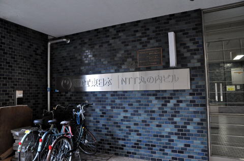 電話交換創始之地碑 *丸の内ビル南西・日本工業倶楽部ビル壁面。