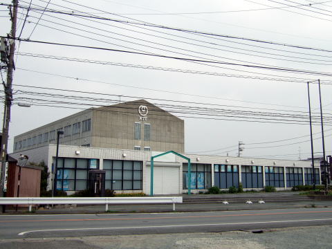 学校の体育館のような五角形の面白い事務棟。
