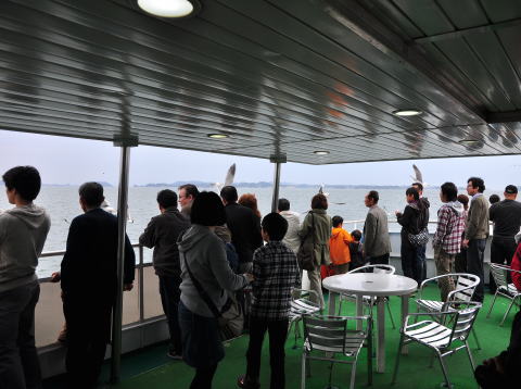 再開直後の松島遊覧船内。多くの観光客でにぎわっていました。