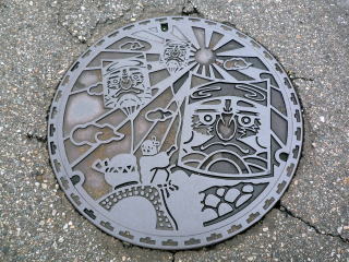 局前にあった、旧大門町の名残り「だるま凧マンホール」。