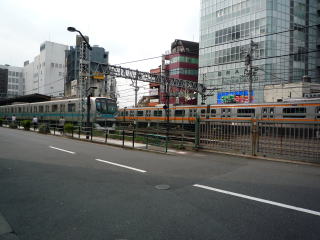 [右]局前を走るJR中央線。局は荻窪駅前にあります。