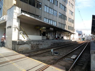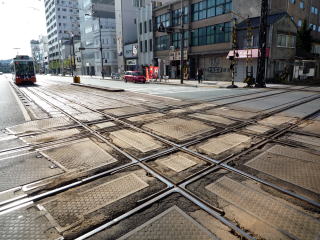 駅前の「ダイヤモンドクロス」(路面電車と郊外電車の平面交差)。