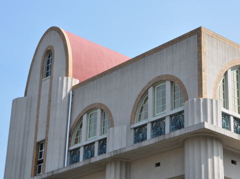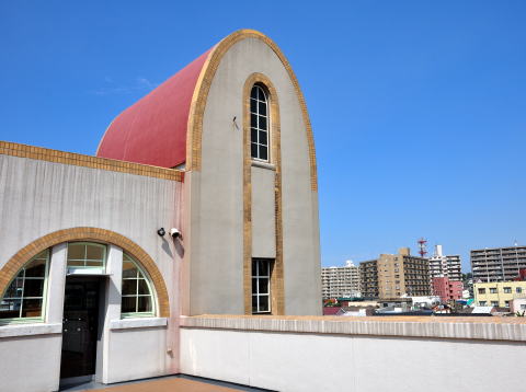 3階屋上から見た、パラボラアーチの赤屋根。