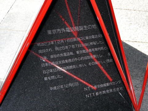 明治23年12月16日辰の口に東京電話交換局が開設され、同25年7月7日当地に移転した。以後、東京市外電話局,、東京電話番号案内局として日本の電話交換業務の中心的役割を果たし、昭和62年8月建物再開発に伴い, その輝かしい歴史の幕を閉じた。