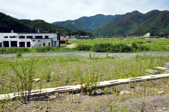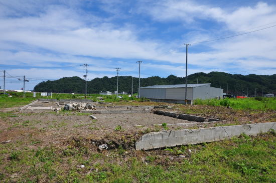 津波で流出した鵜住居駅から見た鵜住居地区と、局舎。