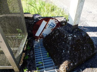 局前のバス停看板は、朽ちていました。(バス停名:平野)