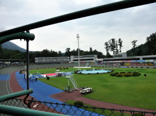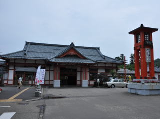 弥彦駅と、村営・弥彦競輪場。
