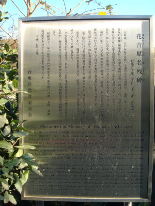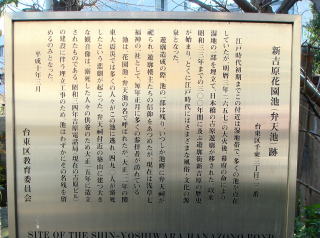 江戸時代初期までこの付近は湿地帯で、多くの池が点在していたが、明暦三年(一六五七)の大火後、幕府の命により、湿地帯の一部を埋めて、日本橋の吉原遊郭が移された。以来、昭和三三年までの三〇〇年間に及ぶ遊郭街新吉原の歴史が始まり、とくに江戸時代にはさまざまな風俗・文化の源泉となった。